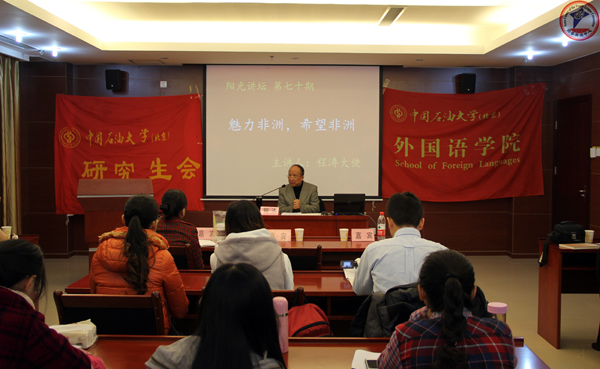 11月9日,中国石油大学在中油大厦311报告厅举行第70期阳光讲坛。原外交部非洲司司长、中国非洲合作论坛中方秘书长、中国驻摩洛哥大使程涛应邀为石大学子带来了题为“魅力非洲,希望非洲”的讲座.