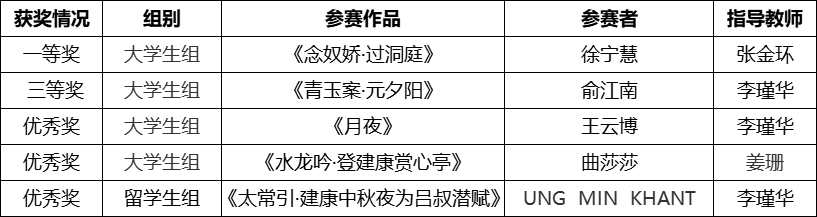 中石大安全与海洋工程学院学生徐宁慧作品《念奴娇·过洞庭》,获大学生组全国一等奖。至此,中石大成为北京高校唯一在教师组、留学生组、大学生组均获过一等奖的高校。未来能源学院学生俞江南作品《青玉案·元夕》获三等奖,机械与储运工程学院学生王云博、外国语学院学生曲莎莎、留学生UNG MIN KHANT的作品获得优秀奖,学校获奖总成绩名列北京高校第二名。