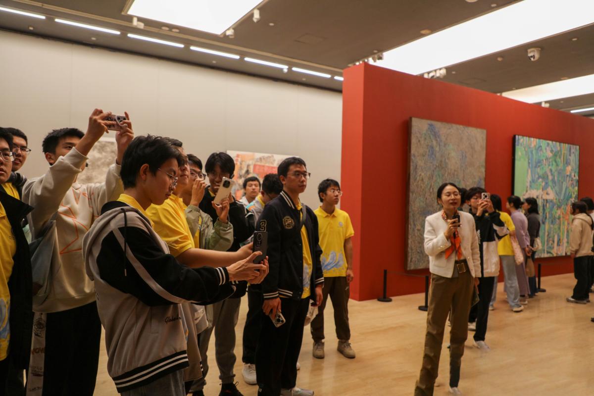 在中国美术馆主展厅,师生们在杨儒老师的带领讲解下,认真学习《金色土地》《休戚与共》《山河颂》等画作创作思路、作品解析,沉浸在优秀文化艺术作品的氛围中。在安静有序的参观过程中,同学们在一幅幅、一件件作品前时而拍照留念,时而低声交谈,时而驻足观望。师生们在《向海图强 逐梦深蓝》等各类体现新时代主题的书画雕塑、工艺美术、壁画作品中流连忘返,共同品鉴美术之韵,感受中国写意、写实等画作的审美意蕴,领略艺术对新时代的展现。