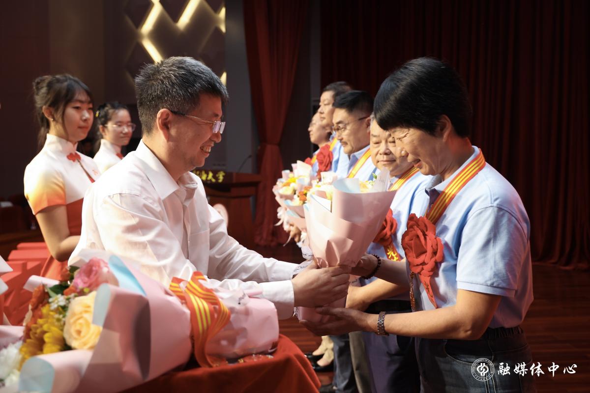 韩克飞和刘植昌为从教三十年的教师代表颁发证书和纪念奖牌。致敬他们三十载的奉献付出,以及“躬耕教坛、强国有我”的使命担当。