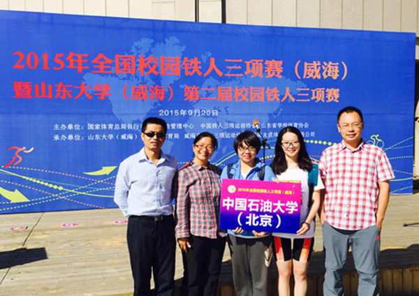 在北京市丰台区举行的2015北京国际铁人三项赛,吸引了来自世界各地的1600余人参加,石大7名学生参加了奥运标准距离的比赛。在连续1.5km游泳、40km自行车和10km跑步中,他们凭借石油人百折不挠的精神,勇往直前,顺利完成比赛,其中刘欣然获得女子标准距离20-24岁组第五名,彭博文获得男子标准距离20-24岁组第六名。