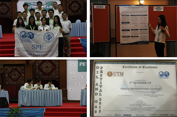 11月15日,Oil & Gas Festival 2015(OGFEST 2015)在马来西亚理工大学(University of Technological Malaysia- UTM)开幕,活动吸引了来自马来西亚、中国、英国、日本、德国、印度尼西亚等10个国家的16所高校近130名选手参加,活动包含多个竞赛及相关交流活动。石大SPE学生分会选派选手参加了石油地质学知识竞赛、石油工程知识竞赛和论文大赛,石大学生裴艳丽脱颖而出,获得Paper Poster亚军。