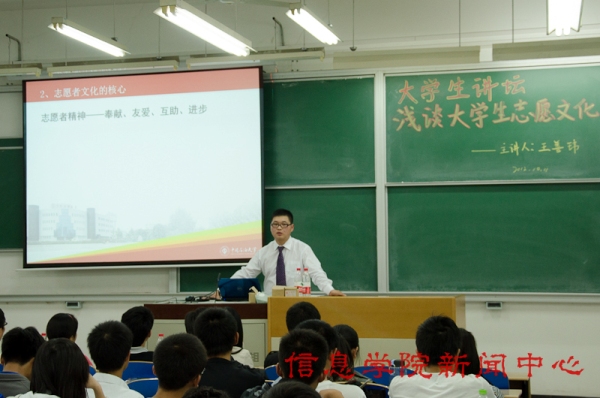 王善玮曾担任第二届信息学院青年志愿者协会的主席、第二届校青年志愿者协会副主席,多次获得校内外优秀志愿者称号,被团中央授予“关爱行动项目专员”称号。讲座中王善玮根据自身的志愿者经历,就志愿服务的起源、志愿服务的内涵以及石大志愿者活动现状三方面作了系统的解说,生动阐述了志愿者追求的“奉献、友爱、互助、进步”的志愿者精神。同时向与会同学简单介绍了石大志愿活动的平台,鼓励大学生积极参加这些志愿活动,并充满感情地向同学们介绍信息学院的志愿者历程与志愿文化。此外,王善玮还对石大志愿类社团的发展提出了自己的建议。