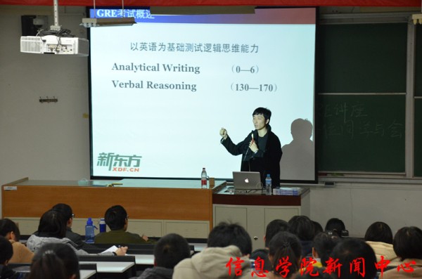 11月7日晚,石大地球物理与信息工程学院在第三教学楼105教室举办了以GRE备考为主题的讲座。新东方北美部老师王小丹担任主讲。本次讲座由信息新闻中心主办。