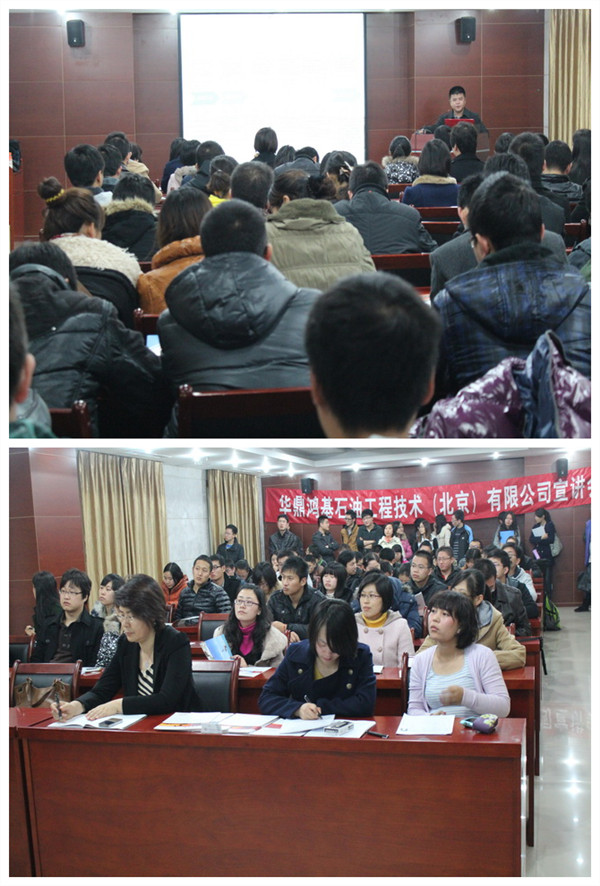 11月21日,北京华鼎鸿基石油工程技术有限公司在石大举行招聘宣讲会。本次招聘会面向石油工程专业以及外语专业的本硕生。北京华鼎鸿基石油工程技术有限公司总裁刘阳、技术中心总监郝明以及人力部门相关负责人出席本次招聘宣讲会。