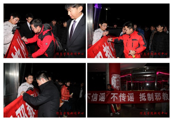晚会开始前,信息学院在科学会堂门口举行“不造谣、不信谣、不传谣,抵制邪教从我做起”签名活动。王智广、庄玉琳以及各年级辅导员和学生在签名条幅上签字,号召全体师生崇尚科学,构建文明和谐校园。