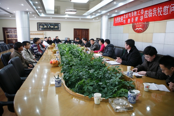 2月3日下午,农历鼠年春节前夕,在市教委科研处处长叶茂林的陪同下,北京市委教育工委委员高祥阳专程来我校看望和慰问了寒假留校过节的家庭经济困难学生代表,并与学生代表和学校部分职能部门、服务部门和院系学生工作负责人进行了座谈。校党委副书记吴小林教授出席座谈会并主持了会议。慰问学生代表前,高祥阳委员代表市委教育工委和市教委给我校家庭经济困难学生带来了10万元慰问金,用于学校统筹安排寒假期间留校过节的家庭经济困难学生、受灾地区家庭经济困难学生等学生资助工作。
