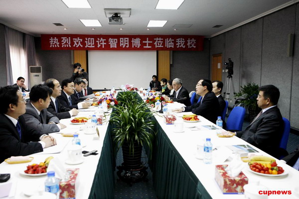 此次再访石油大学,许智明博士非常高兴,并对我校在石油石化领域的科研与教育水平给予了高度评价。他说,随着世界经济发展对能源需求的不断增长,石油在国家能源安全战略中的地位越来越重要,石油石化人才的培养理应得到更多的关注,石油高等院校的发展理应得更多的支持。他希望自己此次为中国石油大学(北京)捐资助学的举动,能够影响和带动更多有识之士关心中国教育事业和石油石化工业的发展,支持中国石油大学教学科研条件进一步改善,使学校在国家富强、民族复兴的伟大事业中担负起更多的社会责任。