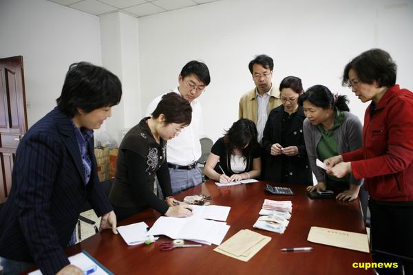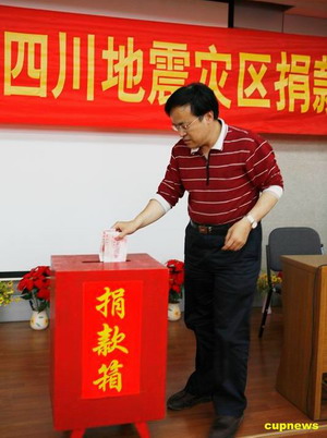 5月15日下午,学校在国际交流中心举行了捐款救灾仪式,全体二级干部、学术带头人暨学校统战成员代表人士纷纷慷慨解囊,救助灾区人民,共捐款58600元。当天上午,机关20个工会小组,不包括二级干部,共计330名干部职工、离退休老同志、助管、合同工踊跃捐款,共收到捐款 36904元。特别是有些同志,平时吃穿都很节俭,捐款时毫不犹豫的拿出了500元献给灾区,令人感动。