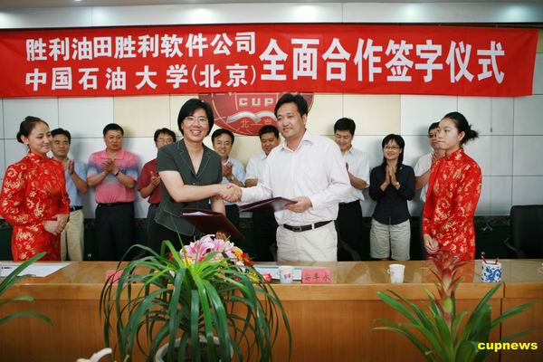 7月11日上午,我校与胜利油田胜利软件公司签署全面合作协议,校长张来斌教授、胜利油田胜利软件公司徐亚飞董事长兼总经理出席了会议,并分别发表讲话。校党委副书记吴小林教授主持会议,并代表学校与胜利油田胜利软件公司安丰永副总经理签署全面合作协议。