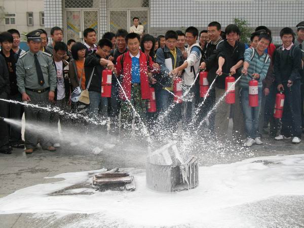 10月17日中午12点半,在三教楼前广场,由保卫处、学工处共同举办2008级新生消防灭火演练活动,大约200多名新生参加。保卫处有关同志给同学们讲解了在校应注意的一些安全防范知识,并就如何正确使用灭火器进行了演示。随后,部分同学使用灭火器进行灭火实战演练。