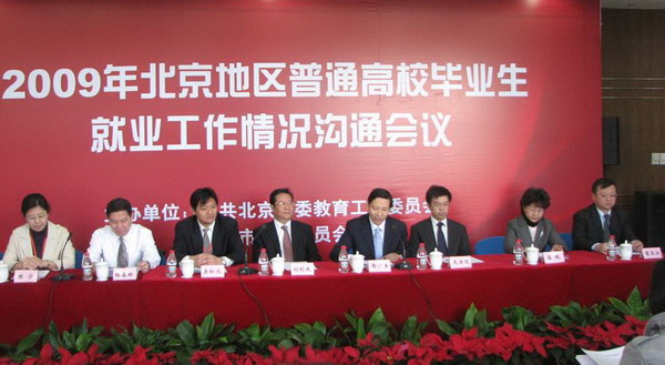 为了贯彻落实《北京市人民政府办公厅关于做好2009年普通高等学校毕业生就业工作的通知》文件精神,全力以赴做好2009年北京地区普通高校毕业生就业工作,北京市教委于3月22日在首都师范大学召开了2009年北京地区普通高校毕业生就业工作情况沟通会。市教委主任刘利民、副主任郭广生、吴松元以及清华大学、人民大学、北京交通大学、中国石油大学、首都师范大学、北京工业职业技术学院主管就业工作的校领导和中央电视台等20多家媒体的记者出席了会议。