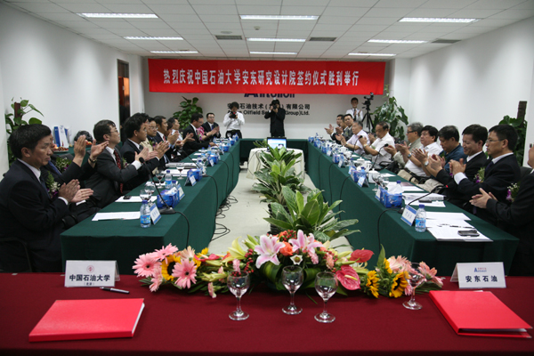 8月27日,我校与安东石油技术(集团)有限公司签约,联合建设中国石油大学安东研究设计院。中国石油天然气集团公司老领导张永一、罗英俊,中国工程院院士苏义脑、沈忠厚,我校校长张来斌、党委副书记吴小林,安东油田服务集团董事会主席、安东石油技术(集团)有限公司CEO罗林,安东石油技术(集团)有限公司总裁潘卫国等出席签约仪式。