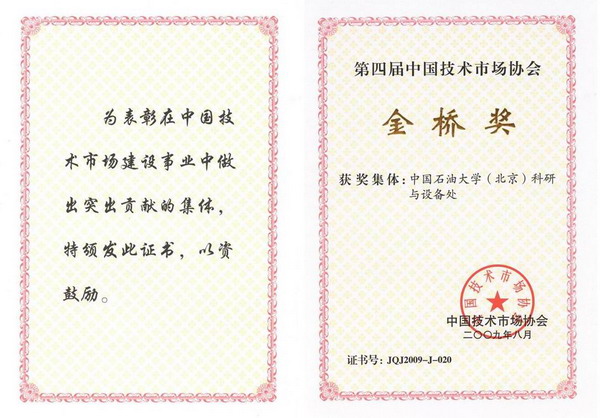 经教育部科技发展中心推荐,中国技术市场协会金桥奖评审委员会评审通过,我校科研与设备处荣获第四届中国技术市场协会“金桥奖”先进集体奖。这是继1997年我校科研与设备处荣获国家科委的“第四届全国技术市场金桥奖”后又一次获得此类奖项。本届中国技术市场协会金桥奖在全国范围内进行了严格审查,共评选出先进集体奖246个,其中高校获奖单位38所,我校是其中之一。