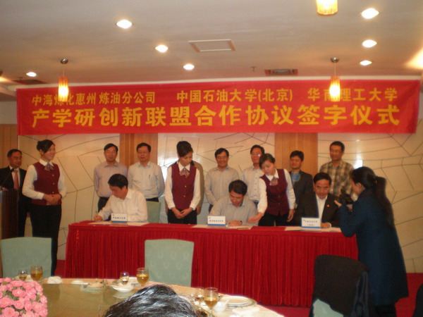 11月28日至30日,校党委书记蒋庆哲书记、副校长徐春明率领化工学院郭绍辉、郭绪强、刘植昌、阎光绪、赵锁奇、陈建义及工商管理学院王琳等诸位教授对中海油惠州炼油分公司进行了访问。访问期间,联合华南理工大学与中海油惠州炼油分公司深入探讨了三方产学创新联盟研合作及化学工程领域工程硕士培养等多项议题,敲定了多项三方联合向广东省科技厅及中海油集团公司申请的科研合作项目。30日下午,在惠州举行了签订三方产学研创新联盟合作协议的仪式。