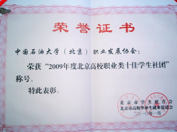 2010年1月9日,2009年度北京高校职业类学生社团年会在北京高校毕业生就业指导中心召开。会上表彰了2009年度北京高校职业类学生社团先进集体及个人。我校职业发展协会荣获“2009年度北京高校职业类十佳学生社团”称号(北京市共十所高校社团)。职业发展协会秘书长李祥虎作为职业类十佳学生社团的四位社团负责人代表之一,在大会上做典型发言,总结汇报了我校职业发展协会2009年度工作情况。