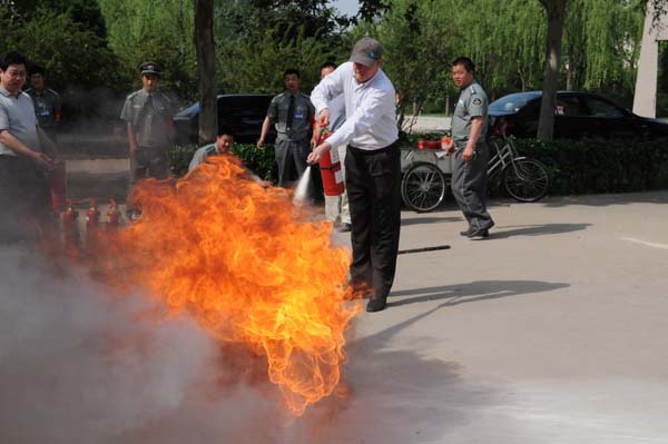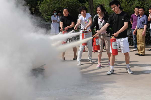 培训开始,保卫处工作人员结合2010年以来学校发生的火情火险,对消防基础知识、火灾现场如何紧急疏散、如何自救逃生、如何扑救初期火灾,灭火器如何使用等内容进行了详细讲解。随后,在广场上点燃了火盆,机关各部门参训人员纷纷拿起灭火器进行灭火实战演练。