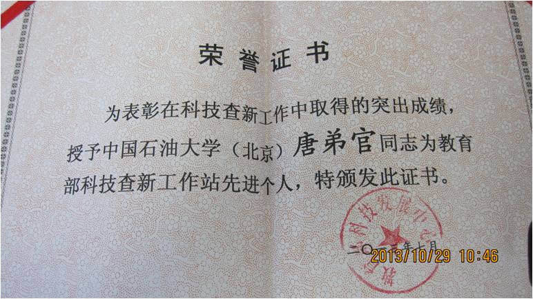 唐弟官同志个人业务能力突出,2004年5月取得教育部第一批查新员资格,2010年5月取得审核员资格,近年来一直从事查新报告的审核工作。自2008年起担任教育部科技查新工作站(SH01)业务负责人以来,唐弟官同志建立健全了规章制度和业务规范、为图书馆引进高层次专业人才、拓展了业务范围。查新数量和质量都有了大幅的提升:数量上,年查新量从2007年的101项增长至2012年的575项;质量上,在教育部科技发展中心2012年发函表彰的7所高校图书馆中,石大查新站名列第一。