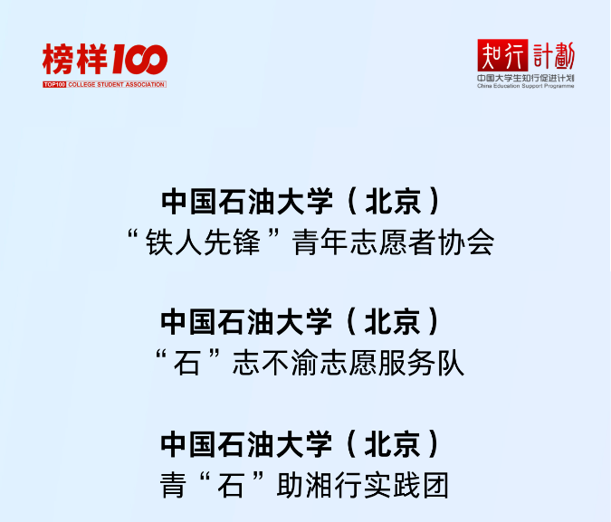 近日,由中国大学生知行促进计划、青年影响力创新中心联合开展的“榜样100”全国优秀大学生社团优秀案例入选名单公布。学院“铁人先锋”青年志愿者协会、“石”志不渝志愿服务队、青“石”助湘行实践团三支团队成功入选!