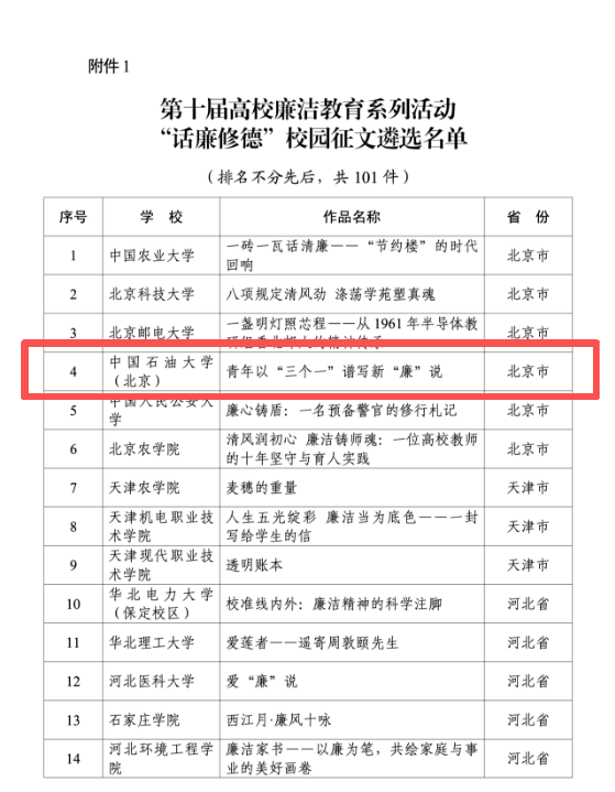 本次教育部第十届高校廉洁教育系列活动,经自主申报、各省教育厅审核把关及专家评审,共遴选出“话廉修德”校园征文优秀作品101件、“绘廉铸魂”创意优秀作品100件,我院2份作品均入选(全校最多)。