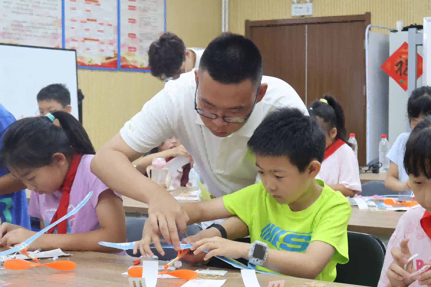 志愿者与学生们共同制作动力飞机手工课