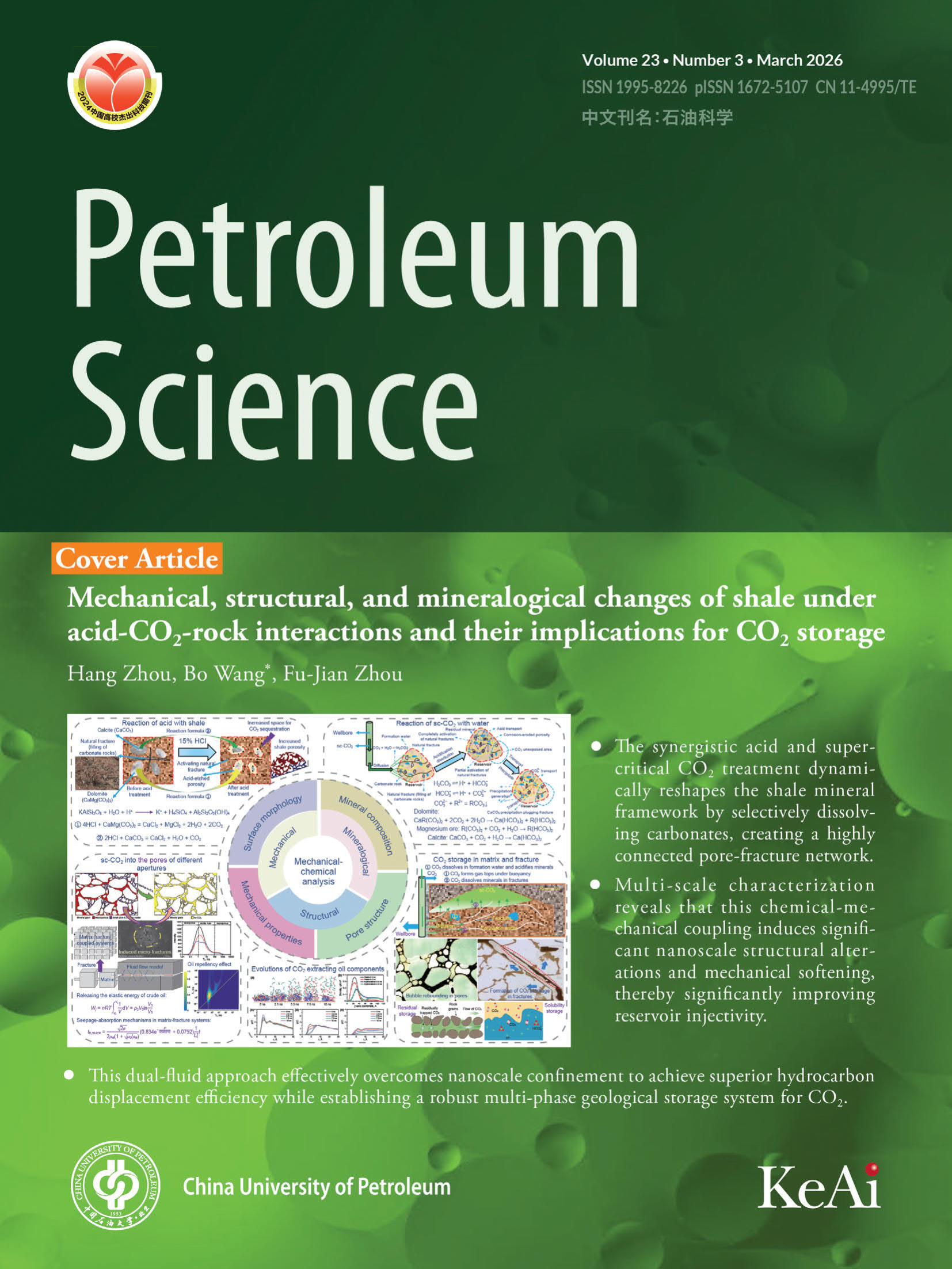 引用方式:Zhou, H., Wang, B., Zhou, F.J., 2026. Mechanical, structural, and mineralogical changes of shale under acid-CO2-rock interactions and their implications for CO2 storage. Pet. Sci. 23 (3), 1261–1279. https://doi.org/10.1016/j.petsci.2025.12.002.[摘要] (