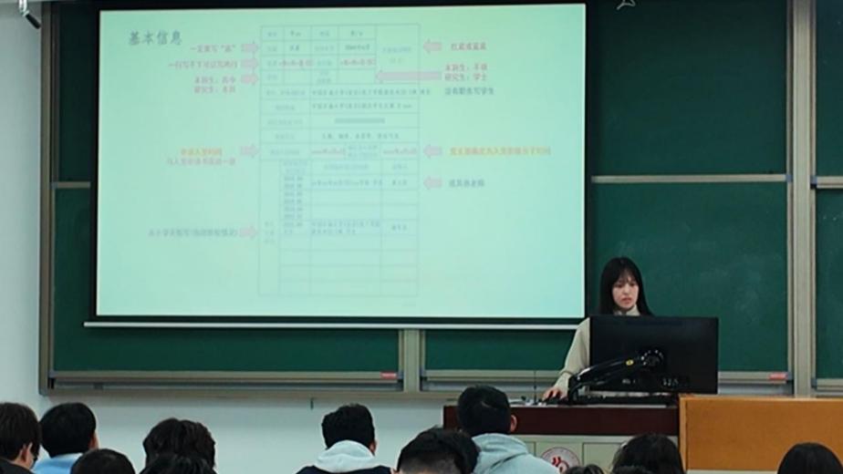 “规范入门——入党文书的写作要求”部分,环工本科党支部学生书记王文紫瑶系统讲解了入党申请书、思想汇报、群众调查意见、政治审查函调及自传等核心文书的书写格式与内容要点。能化本科党支部学生书记钮缨雪则聚焦《入党积极分子考察表》,围绕基本信息、家庭成员、培训经历等填写项目提供详细操作指引,为学员规范撰写入党材料奠定基础。