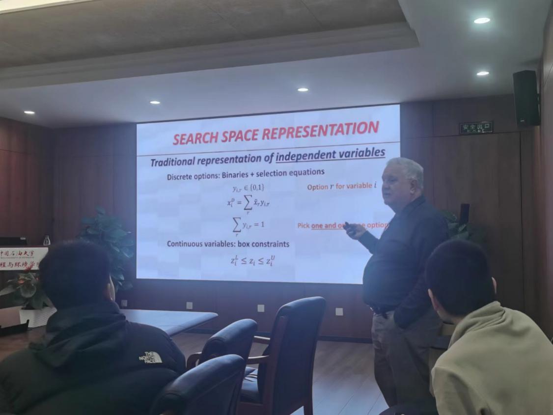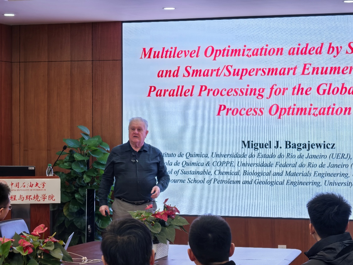 2025年12月9日上午,美国俄克拉荷马大学Miguel J. Bagajewicz教授应邀做客中石大“海风讲坛”,作题为《面向过程工业全局优化的集合修剪-智能枚举-并行处理辅助多层次优化方法》(Multilevel Optimization aided by Set Trimming and Smart/Supersmart Enumeration and parallel processing for the Globally Optimal Process Optimization)的学术报告。讲坛由化学工程与环境学院邓春副院长主持,重庆大学常承林副教授,化工学院王彧斐教授,陈毓秋教授及相关学生参加。
