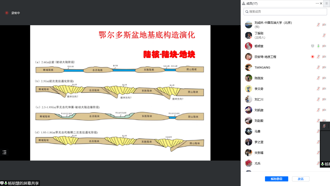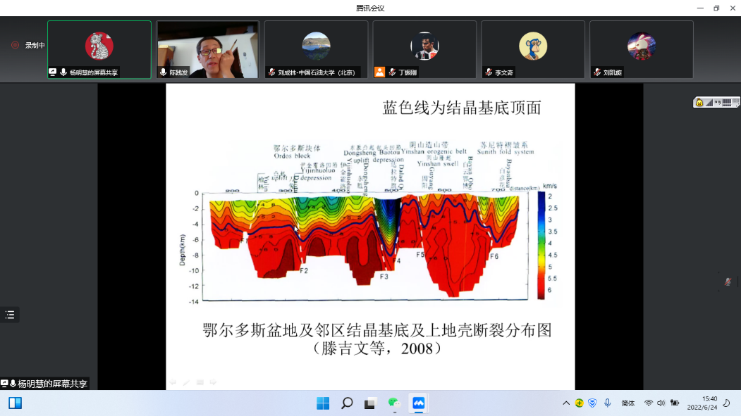 杨老师对大家提出的“同位素定年与岩石地层年代数据可靠性”、“野外基底露头位置”、“重力与磁法资料来源”、“鄂尔多斯盆地热史研究程度”等问题做了认真地解答和探讨。