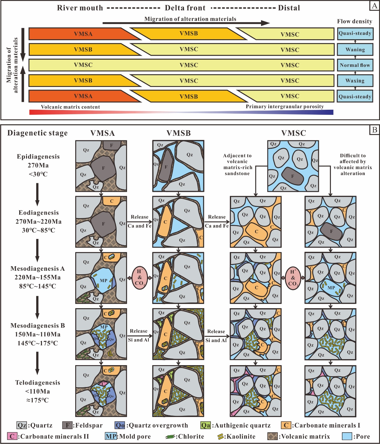 近日,我院朱世发教授研究团队在火山-沉积系统研究方面取得了重要进展。与火山活动相关的沉积序列可以提供大量关于火山作用、构造演化和沉积过程的证据。鄂尔多斯盆地二叠纪河流-三角洲沉积物蕴含了盆地周缘造山带构造演化中丰富的火山活动信息,为火山活动相关沉积过程的研究提供了“天然实验室”。通过对盆地西南部富火山基质砂岩(VMS)样品的岩石学、矿物学和地球化学分析,旨在解决目前尚不确定的火山碎屑物质来源问题,系统阐述了火山相关沉积物沉积和成岩过程。研究认为火山碎屑物质并非前人所认为的来自阴山-燕山造山带,而是来自北秦岭造山带的西南地区。火山频繁喷发,物源区残留的火山碎屑物质在喷发后不久通过河流系统输送到湖盆中。河口/三角洲沉积物具有异重流岩相组合特征,表明VMS可能以异重流的形式搬运和沉积。在随后的埋藏阶段,按照火山基质含量的差异将VMS分为3种类型,它们具有相似的矿物共生序列,但成岩强度不同。3类砂岩自生矿物含量和孔隙结构等差异与火山基质成岩蚀变演化密切相关。该研究提出了北秦岭造山带前人未提及的构造热事件,完善了与火山作用相关的异重流理论体系,这一贡献为类似构造背景的湖盆沉积成岩过程提供了新的启示。