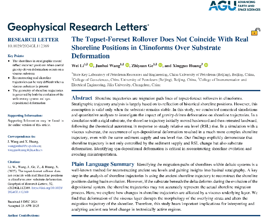 近日,我院2021级博士生李威在王俊辉副教授与葛智渊教授指导下,联合吉林大学黄兴国教授合作完成的论文《The Topset‐Foreset Rollover Does Not Coincide With Real Shoreline Positions in Clinoforms Over Substrate Deformation》发表在自然指数期刊《Geophysical Research Letters》。李威为论文第一作者,王俊辉和黄兴国为通讯作者,中国石油大学(北京)油气资源与工程全国重点实验室和地球科学学院为第一完成单位。