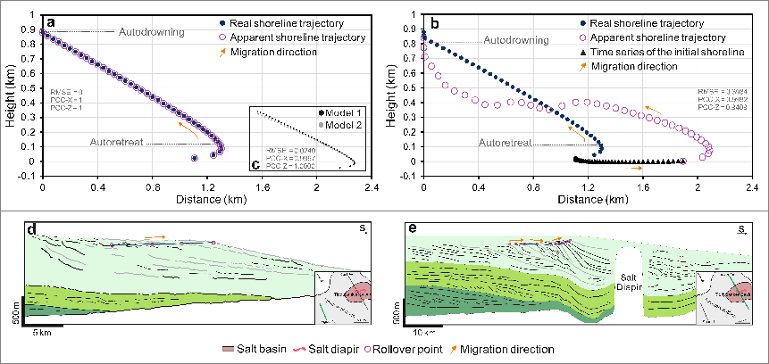本研究基于海岸线自动后退原理、盐构造变形机制,通过开展地球动力学数值模拟,研究了基准面上升过程中粘性基底对海岸线轨迹的影响,并揭示了相关的重力变形机制。研究结果表明,当存在粘性基底时,沉积物仅通过重力拓展作用就能够驱动基底变形并改变沉积后的海岸线位置(顶积层和前积层的坡折点),从而掩盖真实的海岸线轨迹。复杂的变形过程不仅导致坡折点纪录的海岸线轨迹不真实,还难以基于现今轨迹准确重建真实的海岸线变化。本研究指出,沉积系统演化和同沉积变形对海岸线轨迹的几何形态具有根本性的控制作用。厘清识别的海岸线轨迹和真实轨迹之间的差异对地层学分析和海平面重建具有重要意义,尤其在构造活跃的区域。
