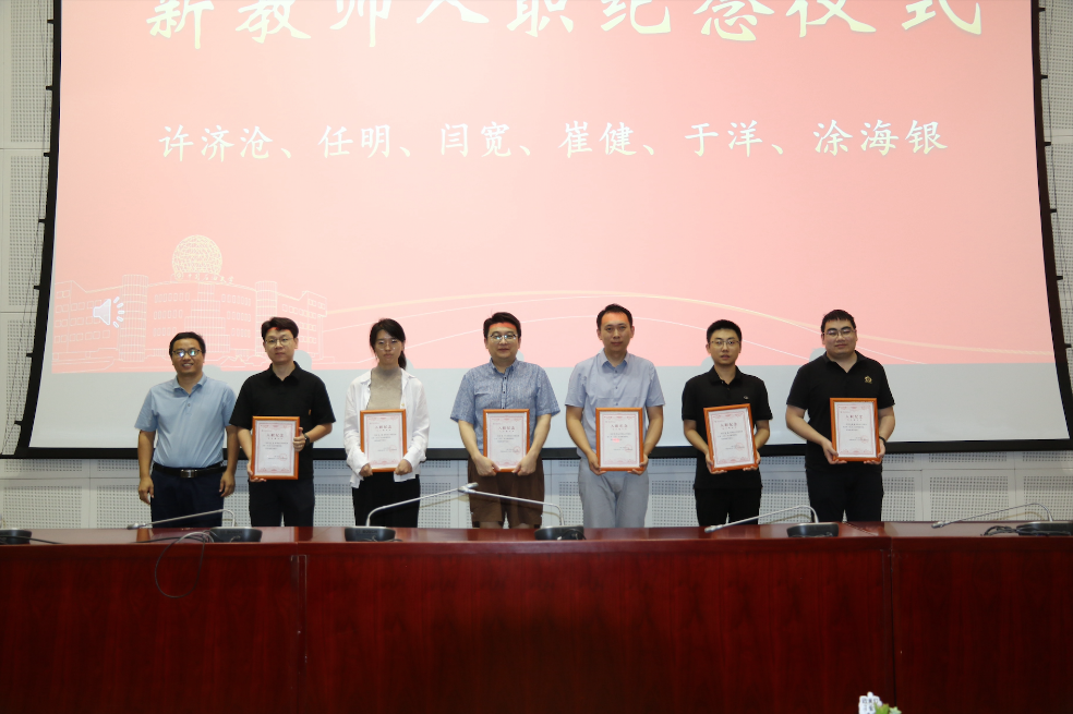 院长王建良向去年12月以来入职的许济沧、任明、闫宽、崔建、于洋、涂海银等六位教师颁发入职纪念证书,闫宽作为新进教师代表发言,表示此次活动让青年教师深切感受到了学院的重视和关怀,也对作为大学教师肩负的责任有了切身体会,他们将不断学习,快速提升专业技能和业务能力,为学院建设贡献力量。