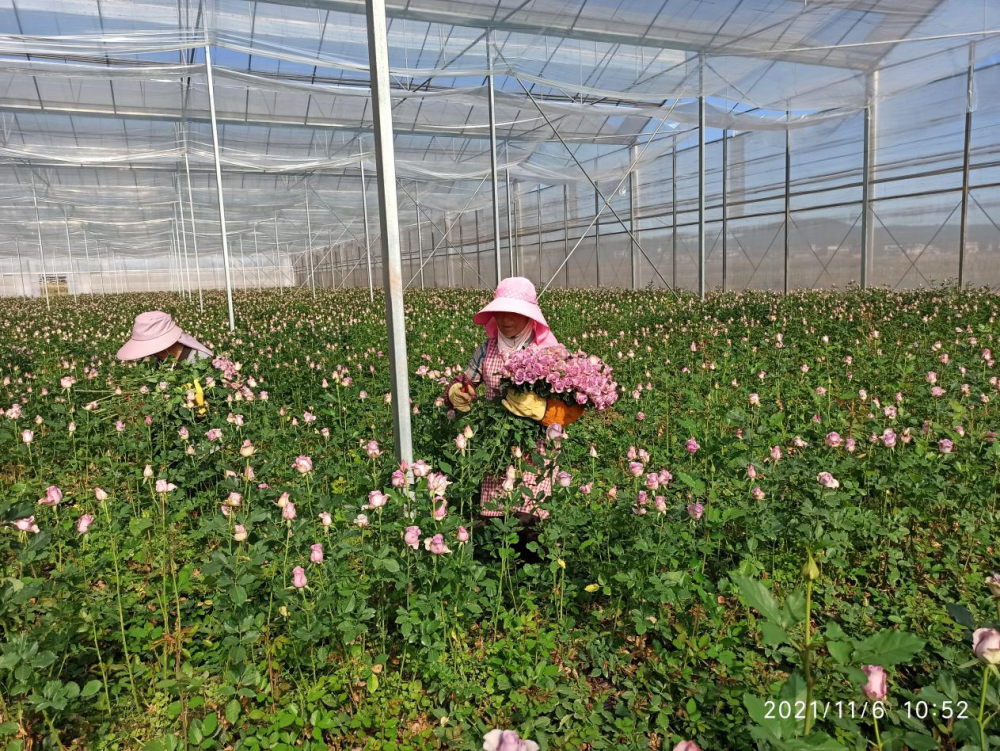 留守妇女在温室大棚务工——采收玫瑰花。(11月6日摄)