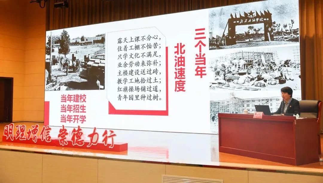 吴小林以三个问题开篇,从“创业、求索弥新、发展、腾飞”等阶段为时间轴展开对“信念、实干、致远”三个角度的讨论,把党的百年伟业、石油石化行业的发展史以及学校的事业发展三者紧密结合,梳理分析了历史主线、发展大势和时代大潮,通过一个个鲜活生动的事例,回顾了学校的发展历程,讲述了学校在国家发展各个时期作出的重要贡献,深刻解读阐释了中石大精神,以及中石大人在不同历史时期的使命与担当。
