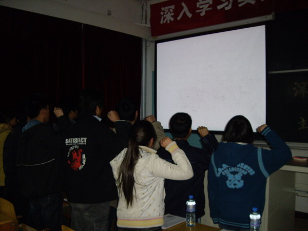 大会在嘹亮的国歌声中开始,接下来即将成为预备党员的10名积极分子在支部书记的带领下庄严地宣读了入党誓言,表明了自己的决心。同时由支部书记强调学习实践活动的重要性,要求支部成员认真学习,做好总结;会上由各团支部书记结合学习情况谈了心得,并与周老师进行了学习交流,周老师就目前学校的总体发展情况于目前学生中的问题与大家深入讨论,收效很大,会议最后组织同学观看了科学发展观的讲座视频,并结合视频进行讨论,使大家深入的了解科学发展观的内涵和实质,并安排进一步的学习计划。