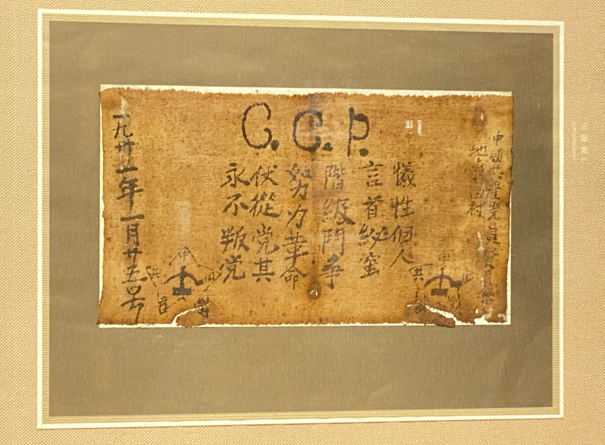 井冈山革命博物馆内,讲解员向实践团成员介绍了重建后的井冈山革命博物馆相关情况,并讲述了重要文物背后的红色革命故事。通过声、光、电、多媒体等现代陈展手段,形象地展现了井冈山斗争的历史面貌,阐述了“井冈山是中国革命的摇篮”“井冈山是中华人民共和国的奠基石”和“井冈山是马克思主义中国化的伟大开篇”等重要论断的历史依据。展馆内陈列着一幅泛黄的粗布,上写着“C.C.P”和“牺牲个人”24字入党誓词,字迹不算工整,甚至还有错别字,这是迄今为止保留下来最早的中国共产党人入党誓词,讲解员分享了这份展品背后的故事,使同学们感受到农民党员对党的热爱之心和对革命的坚定信念。
