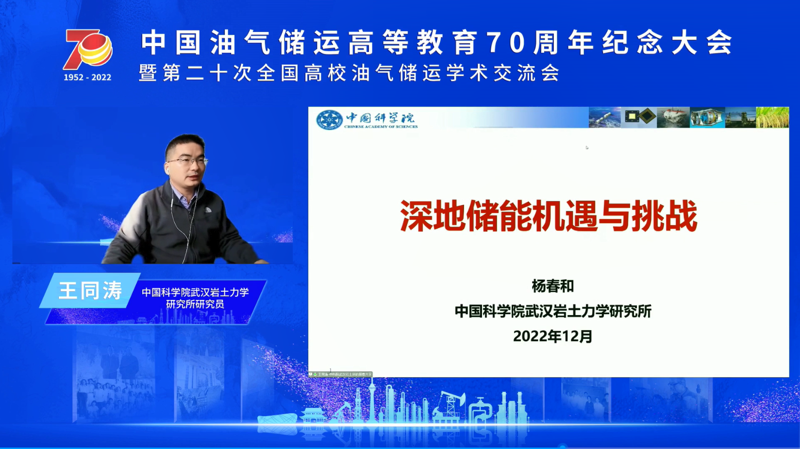 王同涛研究员代表杨春和院士团队作为了题为“深地储能机遇与挑战”的报告。他指出,深地储能是利用深部地下空间实施大规模能源储存,对实现“碳中和”及国家能源安全重大战略需求有重要价值。深地盐穴储能是“能源互联网”关键节点和重要基础设施,利用深部地下空间进行大规模氢能储存和压气发电具有重大意义。