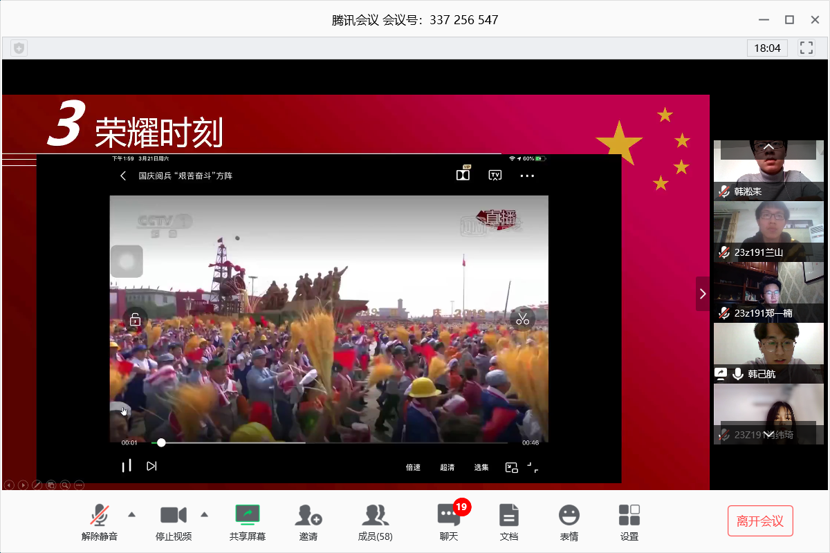 中石大物探18-1班班长韩己航分享了参加庆祝新中国成立70周年群众游行的经历。韩己航表示,参训队员们不怕苦、不怕累,‘精,精益求精’地刻苦训练,只为确保关键时刻的‘万,万无一失’。在讲到走过天安门广场的经历时,他说:“看见习近平总书记向我们招手的那一刻,我们的爱国热情一下子就迸发出来了,虽然已经过去半年,但现在内心依然十分激动,参加群众游行是我最为荣耀的时刻!在彩车落户学校之后,班级同学在彩车前面学习‘铁人精神’,纷纷表示要弘扬艰苦奋斗精神,做勇担时代重任的有为青年。”
