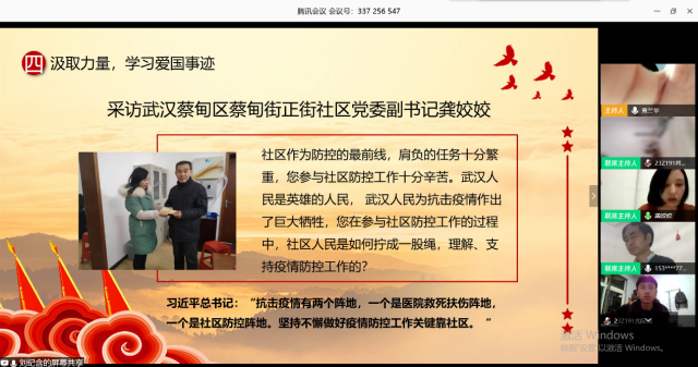 本次“云班会”远程连线武汉市公安局江岸分局劳动街派出所所长王晖、武汉蔡甸区蔡甸街办事处正街社区党委副书记龚姣姣和战“疫”志愿者――中国地质大学(武汉)自动化类专业23Z191班肖纬琦同学,与同学们分享战 “疫”故事、讲述爱国情怀、共话青春担当,并邀请中石大马克思主义学院曹培强教授作为点评嘉宾,对比国内外抗疫所采取的态度、措施和效果,进一步坚定青年学生“四个自信”。
