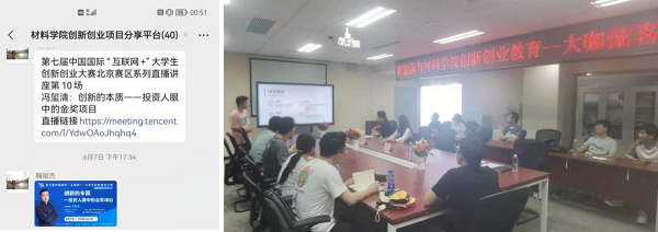 为提升学生创新创业水平,学院专门建立创新创业项目分享平台。及时分享相关赛事信息,为学生争取准备时间;动员全体教师为学生提供科研项目实践机会,鼓励全体本科生提前进入实验室,为学生参与高水平创新创业赛事提供项目支撑;邀请专家为学生创新创业项目进行“一对一”帮扶和指导;利用项目分享平台,定期组织培育项目交流学习,促进项目互相学习、共同进步。