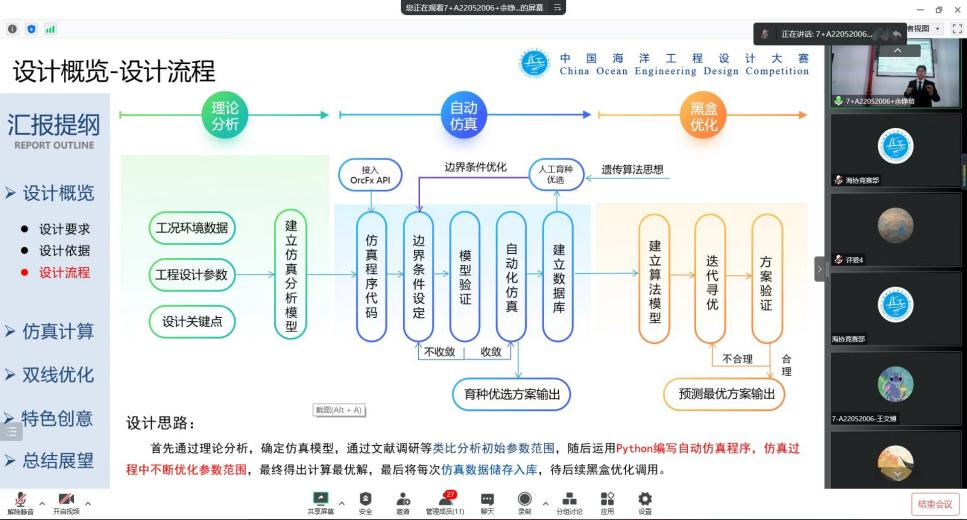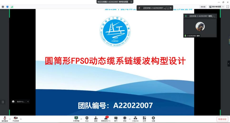 设计制作组以答辩形式开展比赛,来自中海石油(中国)有限公司北京研究中心、中国石油集团海洋工程有限公司的5位专家学者担任评委。各参赛队伍以“圆筒形FPSO动态管缆设计”为主题,播放模型演算视频,并从装备结构、设计思路、模拟数据等方面对参赛作品作了介绍。各评审专家从作品的内容、科技创新性以及工程实践性等方面进行提问,并对各参赛队伍作了点评。
