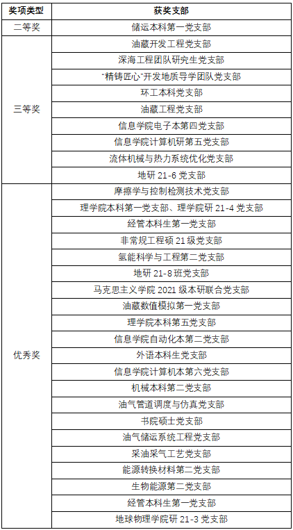 近日,北京市委教育工委公布了2022年北京高校红色“1+1”示范活动评选结果,经学校推荐、专家初评、现场复评等环节,中石大储运本科第一党支部获2022年北京高校红色“1+1”示范活动二等奖,油藏开发工程党支部、深海工程团队研究生党支部等9个学生党支部获三等奖,摩擦学与控制检测技术党支部、理学院本科第一党支部等22个学生党支部获优秀奖,中国石油大学(北京)荣获“优秀组织奖”。