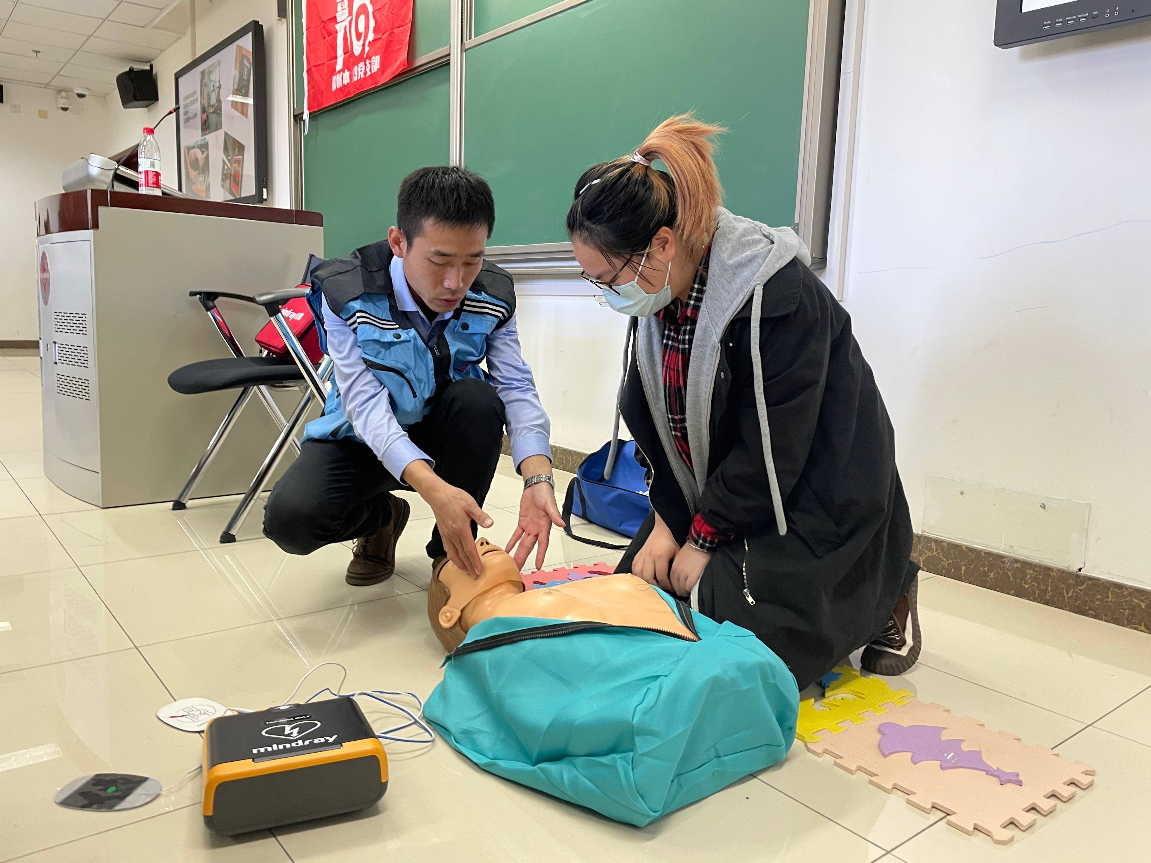 宣教讲师王芳伟详细讲解了海姆立克法、心肺复苏要领和AED设备的使用方法,借助仿真模拟假人及AED教学设备进行现场演示,并现场进行实操体验教学。