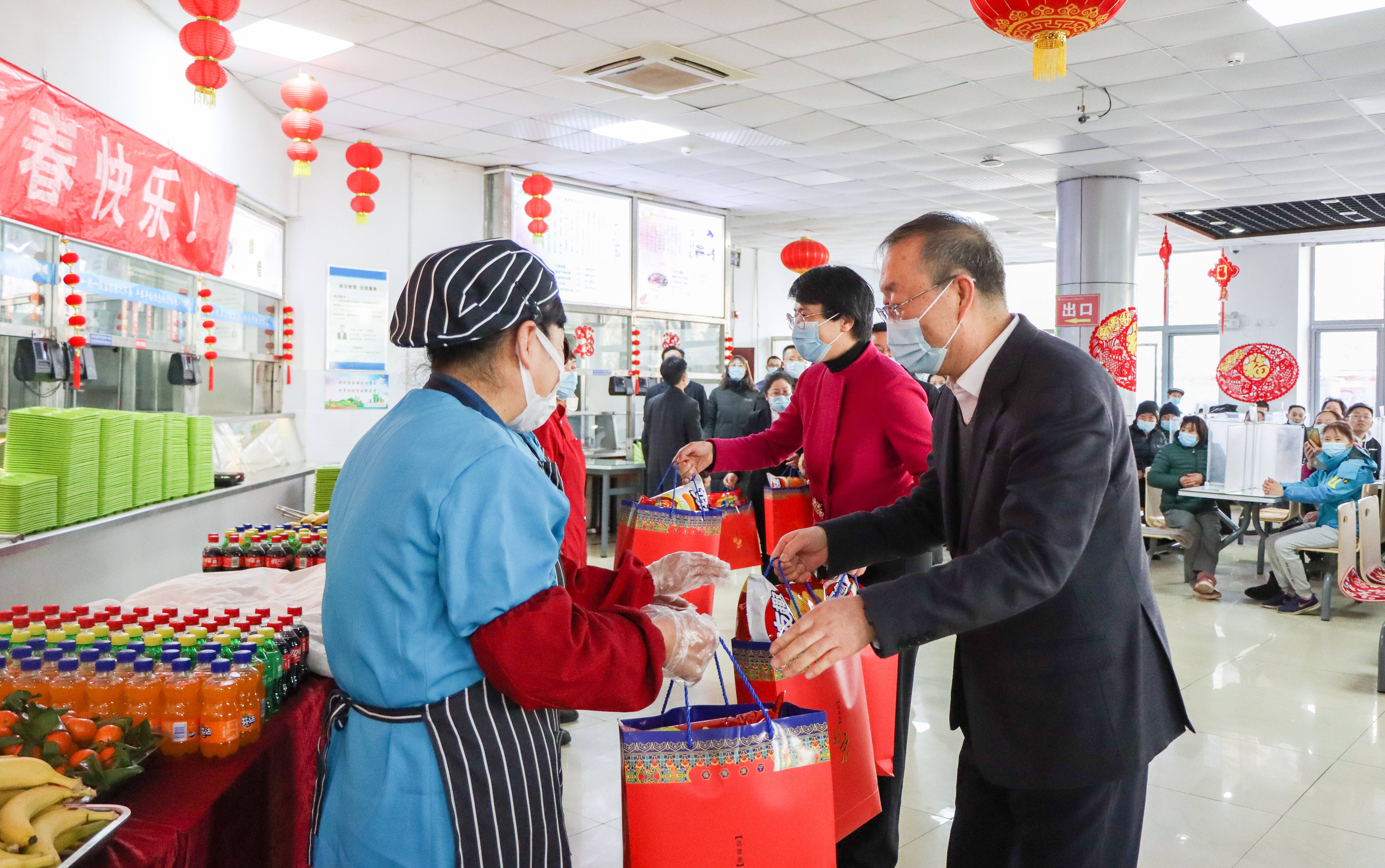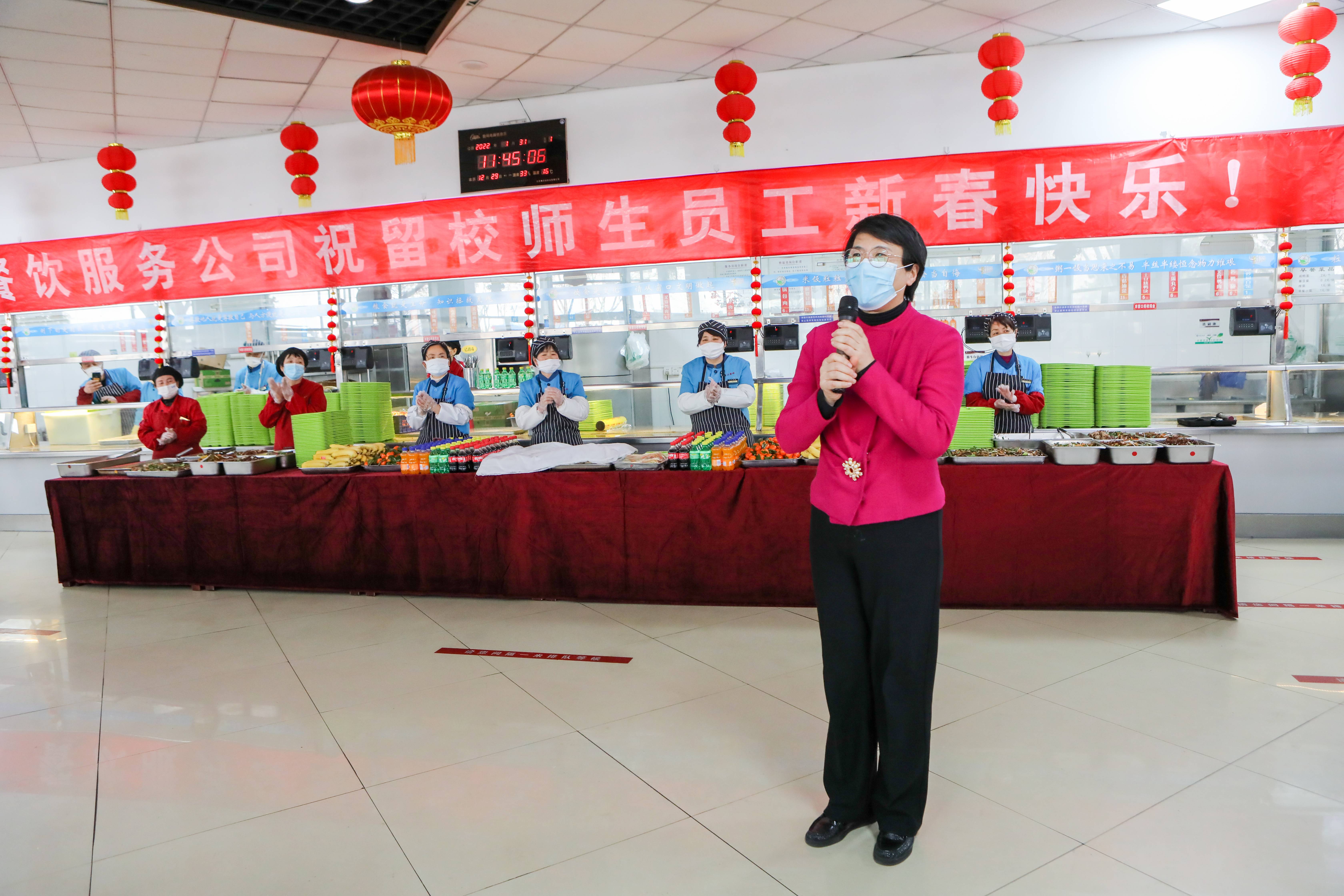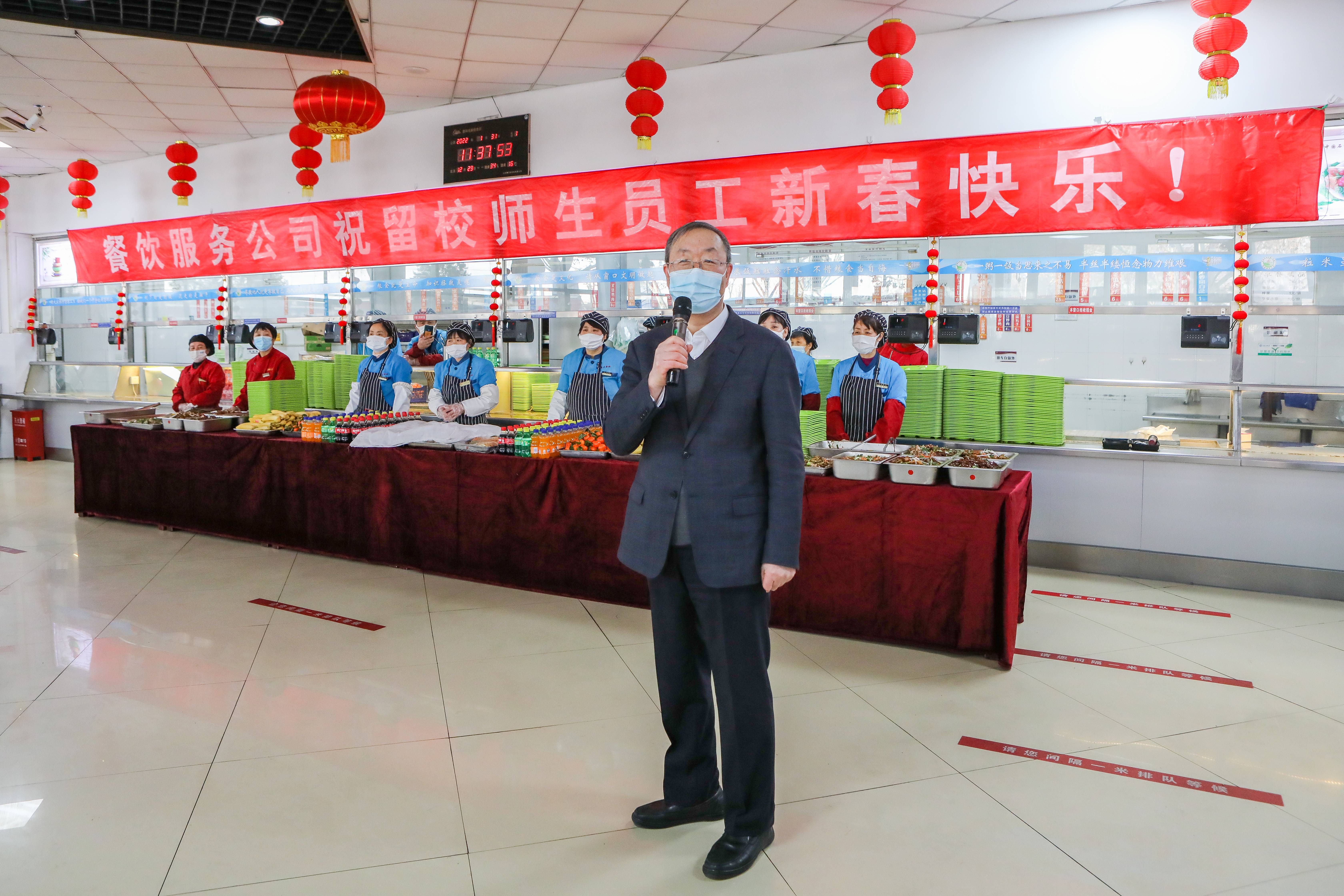 临近中午,陈峰、吴小林来到第二食堂,向工作人员表示慰问,给留校师生员工拜年。