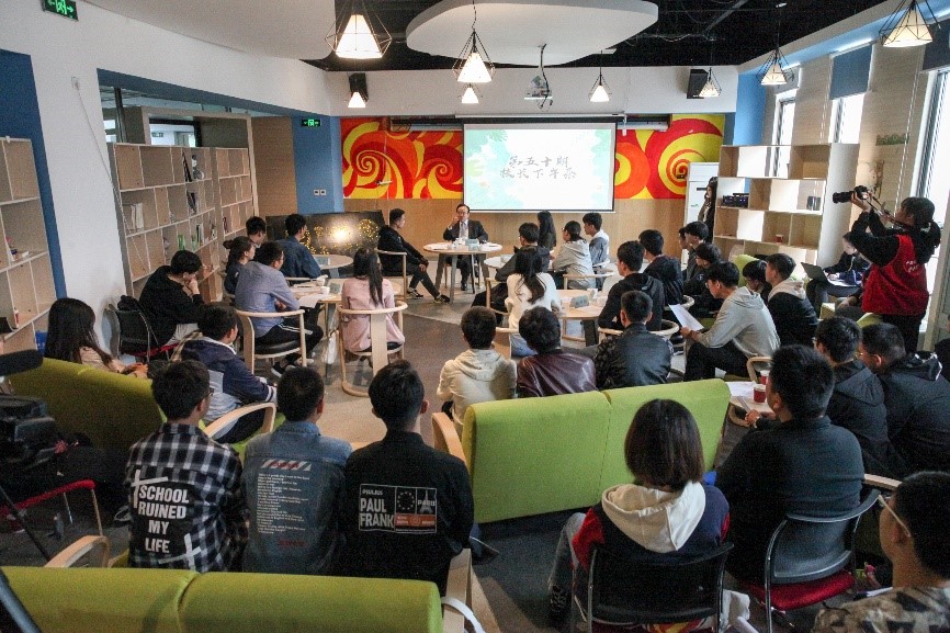 张来斌和两位学生代表共同启动鎏金台,本期“校长下午茶”正式开始。往期的参与者回忆了当年参加“校长下午茶”的情景,结合工作经历谈了校长对自己人生的影响,感谢“校长下午茶”带给自己的精神财富。在校学生敞开心扉向校长倾诉了自身学习发展及未来就业择业的困惑,张来斌引导学生要学会用辩证的思维去分析和判断问题,亲切的话语给了同学们莫大的鼓励。在两个多小时的交流中,张来斌和学生探讨了人生观、幸福观、哲学观,青年责任与担当,五四精神的内涵与传承等问题,也讨论了时间管理、目标设定以及当下网络热点等,以丰富的人生阅历和宽阔的格局视野引导学生结合时代需求,结合自身实际,传承五四精神、坚定爱国信念、掌握知识和本领、提升自身综合素养,担当起新时代赋予的历史重任。