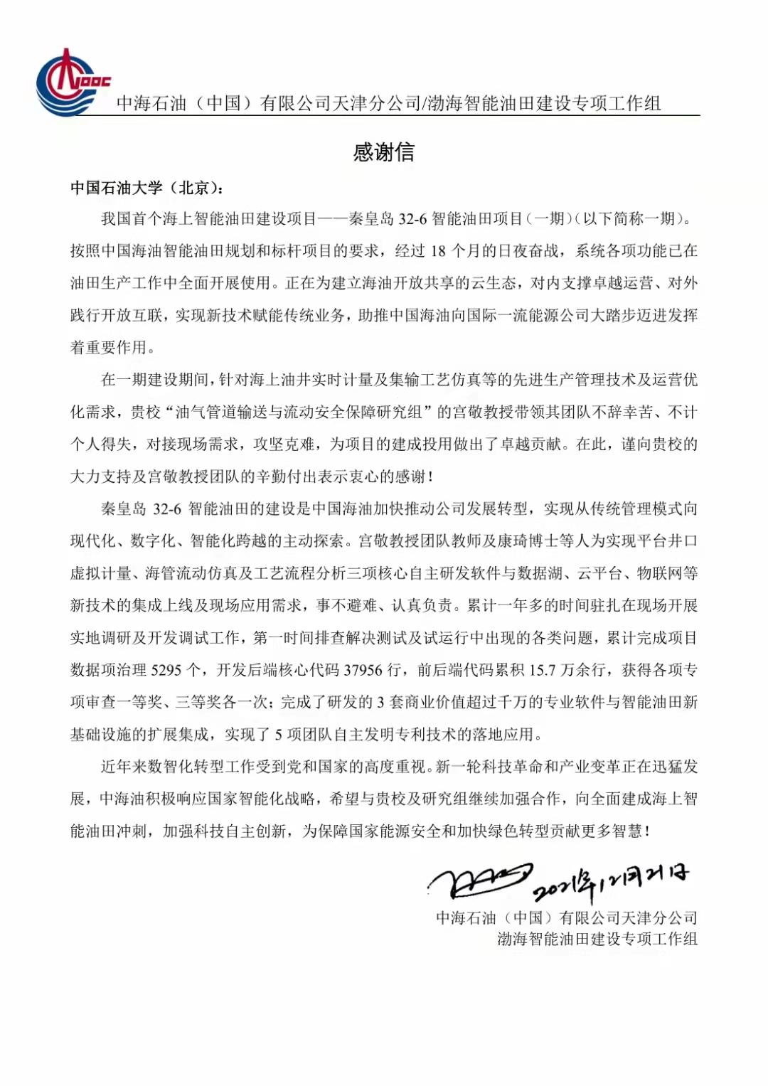 2021年12月21日,中海石油(中国)有限公司天津分公司渤海智能油田建设专项工作组来函,感谢学校对我国首个海上智能油田建设项目——秦皇岛32-6智能油田建成投用的大力支持,以及“油气管道输送与流动安全保障研究组”的宫敬教授及其团队作出的卓越贡献。秦皇岛32-6智能油田是中海石油加快推进公司发展转型,向现代化、数字化、智能化跨越的主动探索。学校宫敬教授团队等累计一年多时间驻扎在现场开展调研及开发调试工作,第一时间排查解决各类相关问题,累计完成项目数据治理5295个,获各项专项审查一等奖、三等奖各一次,完成研发3套商业价值超千万的专业软件与智能油田新基础设施的扩展集成,实现了5项团队发明专利技术落地应用。