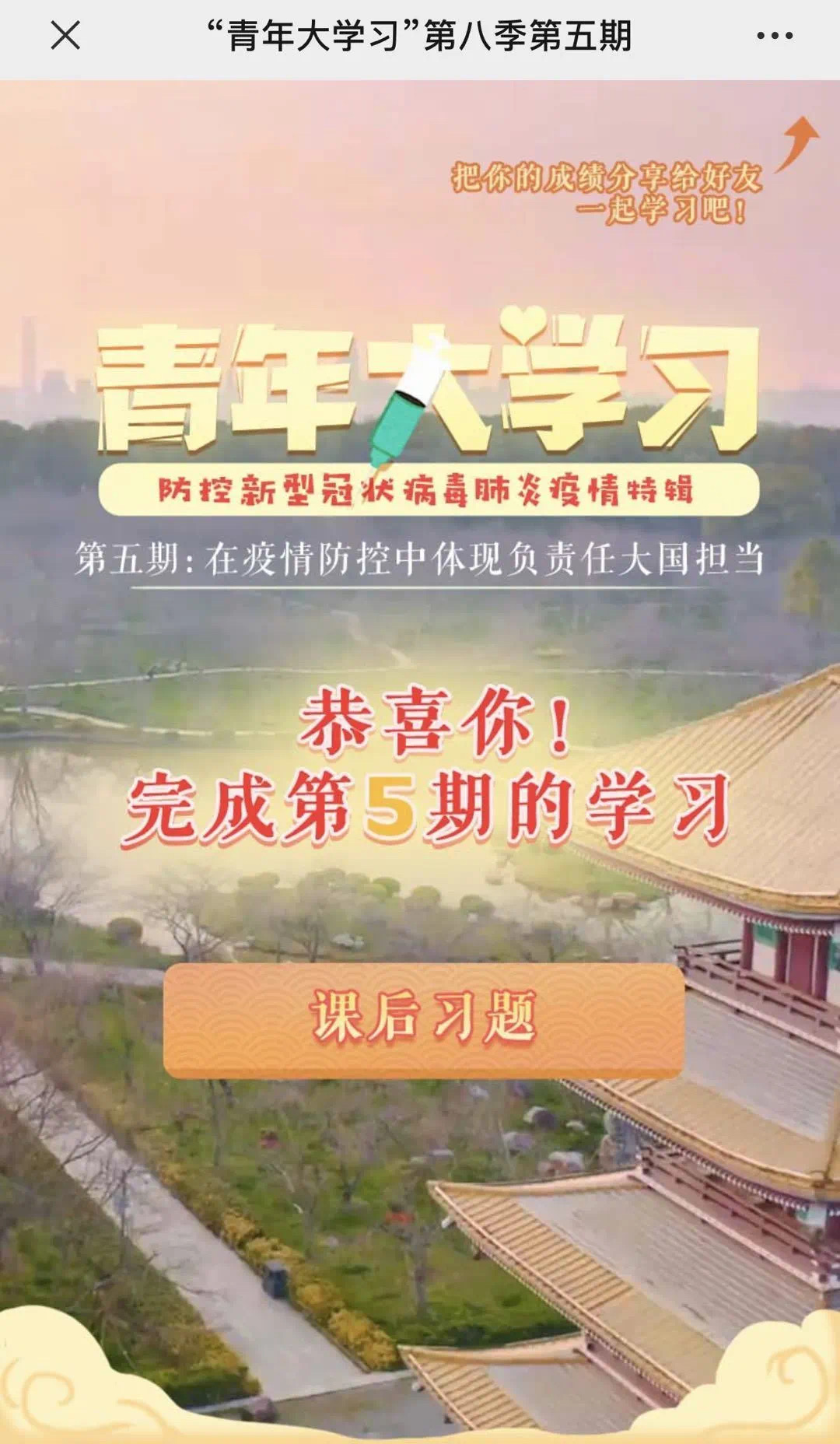 作为团员青年喜闻乐见的学习方式,“青年大学习”网上主题团课由共青团中央宣传部、中国青年报・中青在线联合制作,是团中央动员全体团员深入学习领会习近平总书记“7・2”重要讲话精神的创新举措。2020年“青年大学习”推出“防控新型冠状病毒肺炎疫情特辑”,目前已围绕“坚决打赢疫情防控阻击战”“疫情防控的人民战争”“筑起防控青春长城”“统筹推进疫情防控和经济社会发展”“在疫情防控中体现负责任大国担当”等主题推出网上团课六期,向广大团员青年普及防控疫情的科学方法,传达中国人民团结一致、共克时艰的决心,展现中国共产党领导人民追求幸福生活的责任和担当。“青年大学习”通过灵活自由的网上团课方式,助力团员青年及时学习党的新思想、新理论和新政策。网上团课通过设计签到、辅导视频、随堂测试以及延伸阅读等互动模块,进一步增强了团员们的参与感和学习效果。