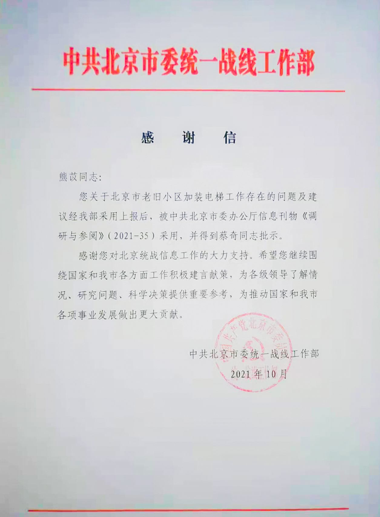 致公党北京市环境与发展委员会委员、学校教师熊苡关于北京市老旧小区加装电梯工作存在的问题及建议被中共北京市委办公厅信息刊物《调研与参阅》(2021-35)采用,并得到市委书记蔡奇同志批示。熊苡在建议中对北京市人口老龄化现状进行了数据分析,概括了北京市老旧小区加装电梯工作面临的突出问题,并提出三点合理化建议。中共北京市委统一战线工作部特致函熊苡老师表示感谢。