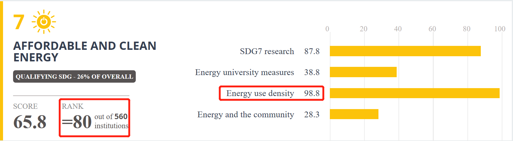 SDG7主要衡量大学在能源方面的研究、能源使用和政策,以及在更广泛的社会中促进能源效率的努力。在SDG7,学校总分为65.8分,在能源使用密度、科研分项得分为98.8分、87.8分,体现了在“双碳”目标背景下,学校在能源产业转型升级和服务构建现代能源体系方面的实际考量和有力做法。
